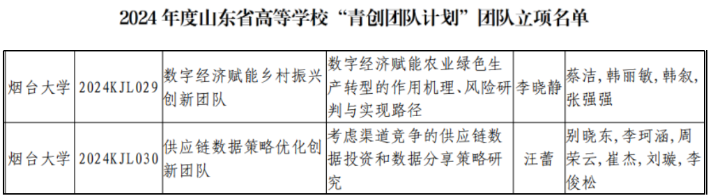 近日,山东省教育厅公布2024年度山东省高等学校“青创团队计划”团队立项名单。成人自拍 李晓静副教授担任团队负责人的“数字经济赋能乡村振兴创新团队”、汪蕾博士担任团队负责人的“供应链数据策略优化创...
