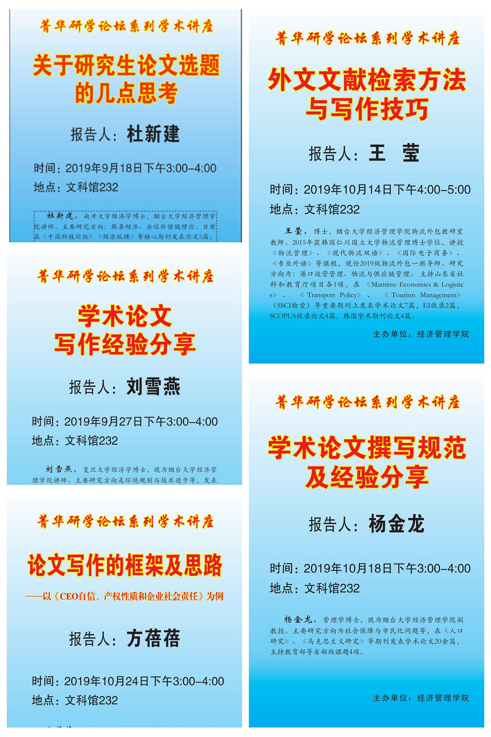 结合经管特色,提高创新能力为目的而召开的。杜新建博士、刘雪燕博士、王莹博士、杨金龙博士和研究生方蓓蓓分别进行了主旨报告。论坛以学术讲座、论文交流和研讨为主要形式,主讲报告人PPT陈述自身的学术经验。现场老师和学生可向报告人进行学术提问,就本学科及相关领域学术论文写作相关问题,进行深入、广泛、自由的学术交流。