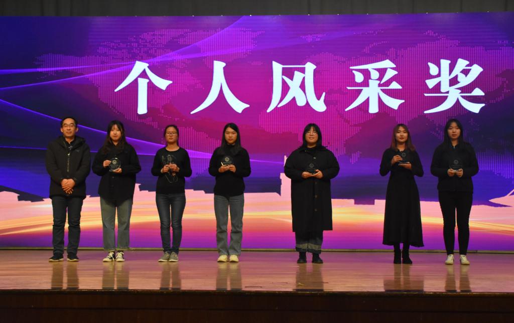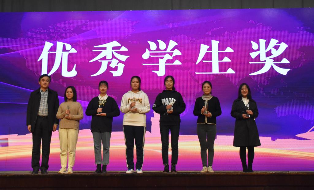 的学生工作。本次表彰大会颁奖环节分为奖学金、创新创业、先进集体、社会志愿与志愿服务、校园活动五个部分;风采展示打破传统形式,融入歌舞、小品、朗诵,展现新时代青年学生斗志昂扬的精神风貌和勇于担责的家国情怀。优秀学生代表崔明月穿插法语、英语、汉语三种语言分享了自己的学习心得;双创先进个人吴浩宇汇报了挑战杯参赛经历,鼓励同学们投身到各项科创竞赛中;红旗团支部经171-2班同学们演绎的班级故事赢得观众阵阵掌声,充满正能量的剧情激励同学们对标先进;朗诵《青春榜样 前行力量》,展现了成人自拍
