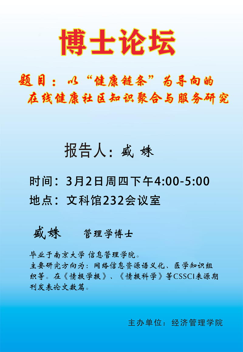 3月2日,成人自拍 在文科馆232会议室举办了“青年博士论坛”第九讲,盛姝博士为此次论坛主讲人。学科带头人、青年博士教师及各专业研究生等40余人参加了此次讲座,讲座由副院长李振杰主持。
