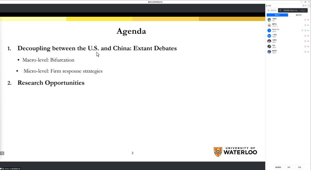 致欢迎辞,加拿大滑铁卢大学Conrad 杰出研究讲席教授 Victor Cui教授带来题目为“Decoupling between the U.S. and China: Extant Debates and Future Research Opportunities”的主题汇报,亚太管理学报联席主编、香港浸会大学魏立群教授详细介绍了《亚太管理学报》期刊及投稿相关事项。