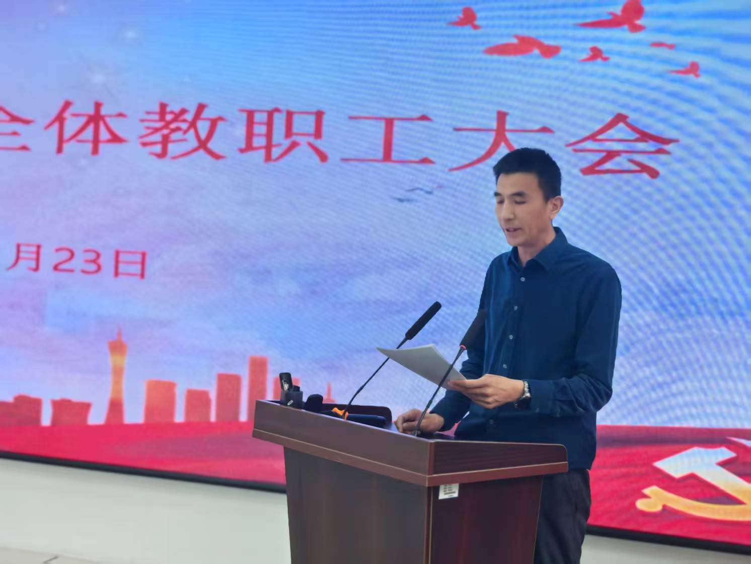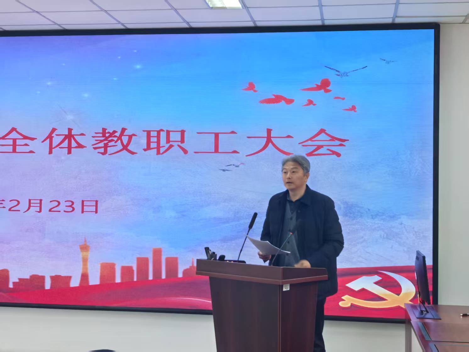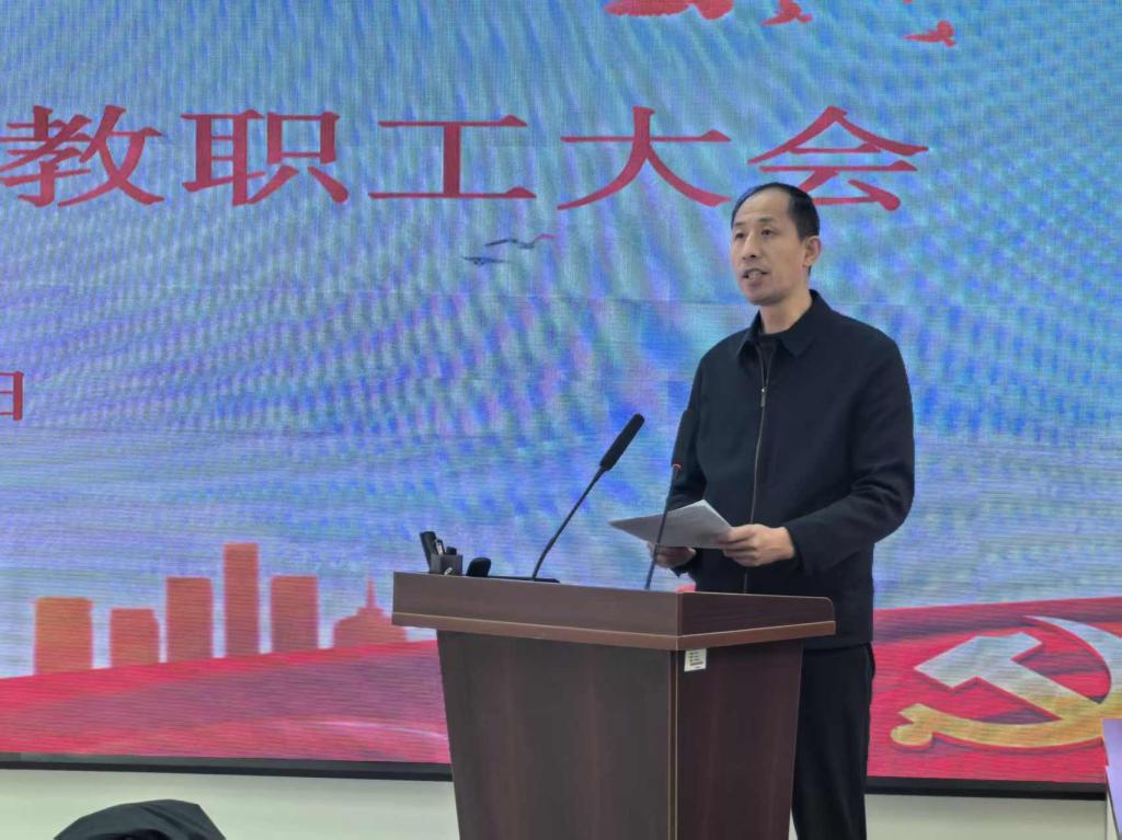 在综合楼307召开全体教职工大会,学院领导班子、教职工代表参加会议。会议由学院党总支书记张广毅主持。