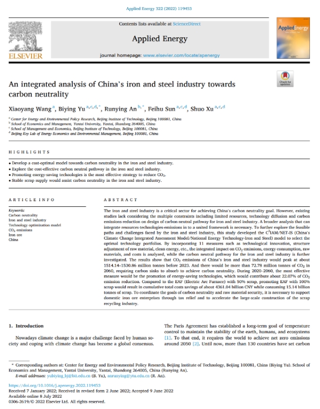 安润颖博士在国际能源领域顶级期刊《Applied Energy》(中科院一区TOP,IF:11.446)上发表题为“An integrated analysis of China’s iron and steel industry towards carbon neutrality”的高水平论文,安润颖博士为本文的通讯作者,成人自拍