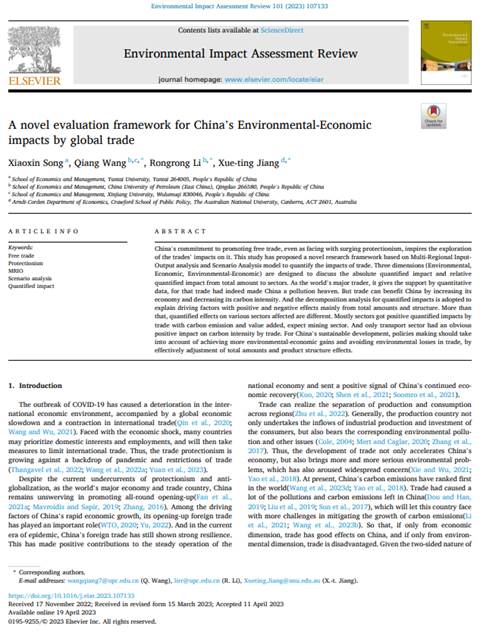 宋晓欣博士在国际环境科学类别期刊《Environmental Impact Assessment Review》(中科院一区TOP,IF:7.9)上发表题为“A novel evaluation framework for China’s Environmental-Economic impacts by global trade”的高水平论文,宋晓欣博士为本文的第一作者,成人自拍