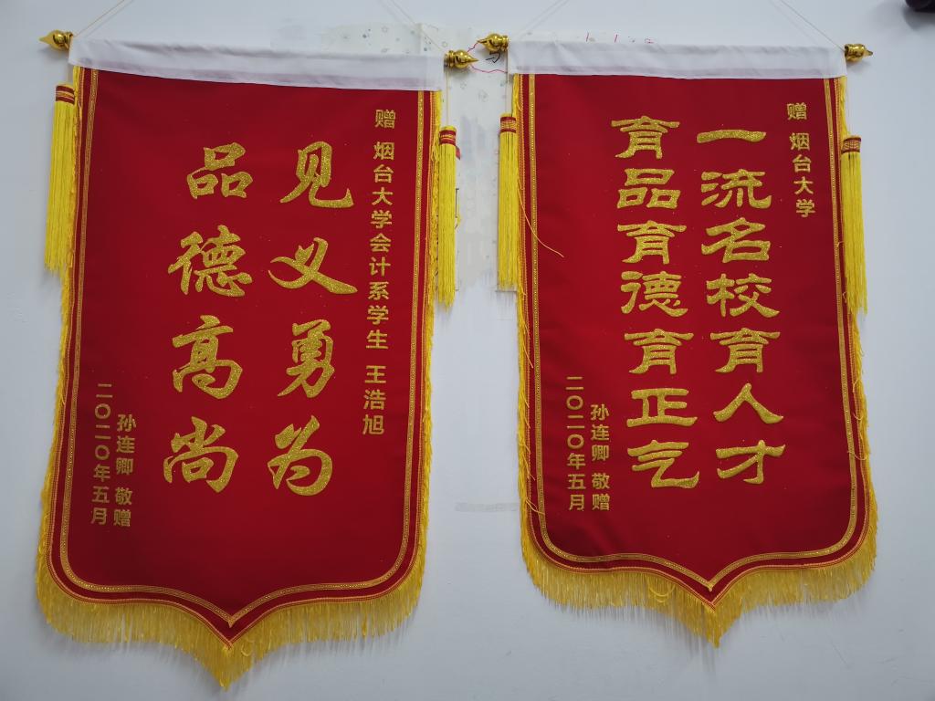 和学院会计系学生王浩旭的锦旗。锦旗上面分别写着“一流名校育人才 育品育德育正气”和“见义勇为 品德高尚”。孙连卿在感谢信中写道:“他的勇敢、冷静、果决、无私、大爱,也少不了老师的日日悉心教导、大力栽培!感谢学校培养出这样的人才,让这个社会充满大爱温暖人心。你们的辛勤工作是社会的大幸,是祖国的骄傲!”