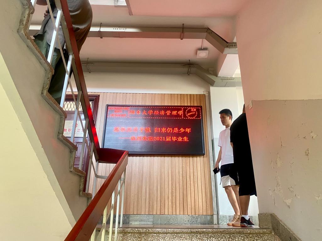 在文科馆三楼的电子显示屏上为今年即将毕业的776名本科生和45名研究生打出温情满满、元气满满的寄语,向即将告别烟园的同学们送去了一份嘱托和祝福,让同学们纷纷进行打卡拍照,“晒图”“发圈”。正值毕业季,成人自拍