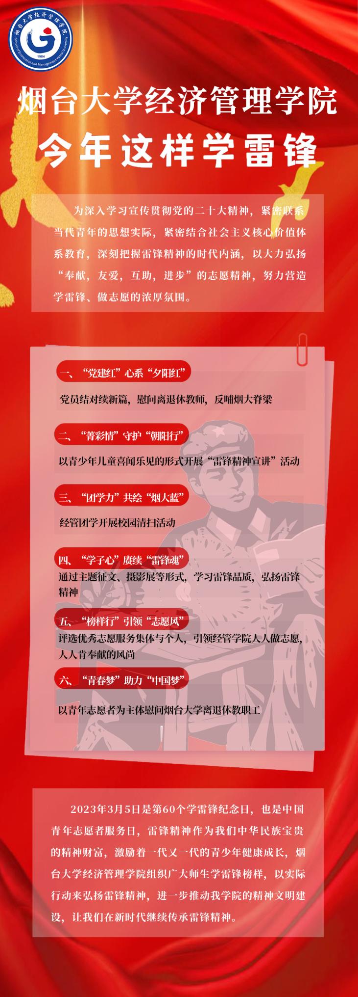 将以“学雷锋榜样、弘时代精神”为主题,组建六支青年志愿者代表团队,分别围绕“党建红”心系“夕阳红”、“菁彩情”守护“朝阳行”、“团学力”共绘“烟大蓝”、“学子心”赓续“雷锋魂”、“榜样行”引领“志愿风”、“青春梦”助力“中国梦”开展六个系列的主题学习活动。穿越历史,雷锋精神永垂不朽,面向未来,经管青年正在行动!