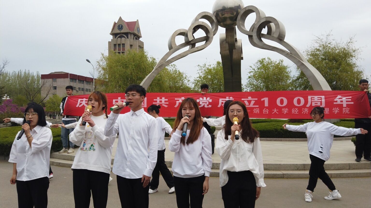 在“升腾”建筑前举办庆祝建党百年学生快闪活动,吸引了数百名同学前来观看。