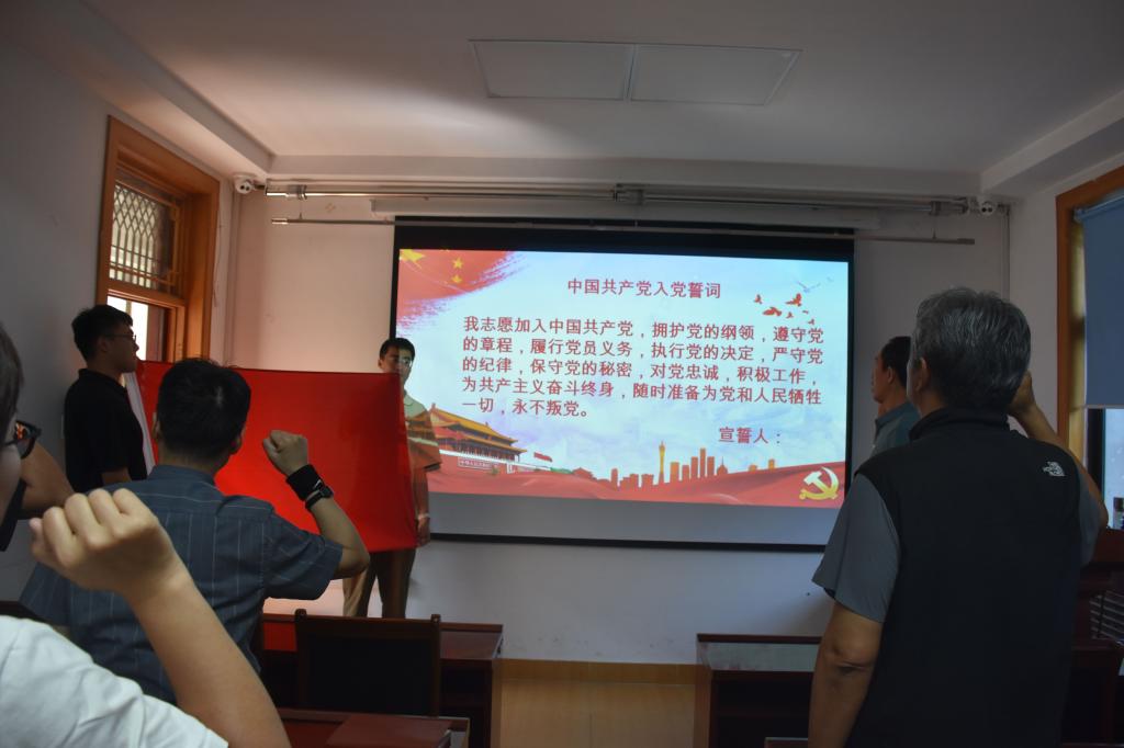 活动伊始,在张广毅的带领下,全体党员面向党旗,昂首挺胸,高举右拳,重温入党誓词。